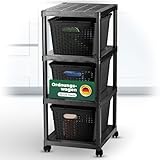 SONGMICS Rollwagen, 3-Ebenen-Aufbewahrungswagen, mit Griff, 2 kleine Organizer, Stahlrahmen, Plastikkörbe, für Schlafzimmer, Waschküche, Badezimmer, Schwarz BSC067B01